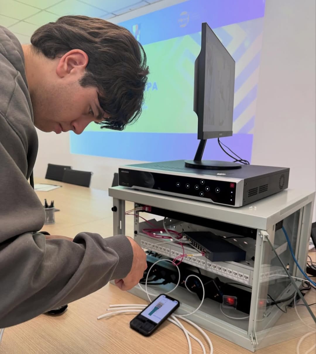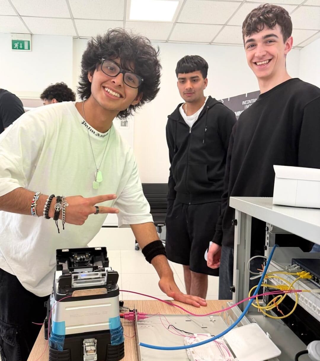 La visita non si è limitata ad essere un semplice tour aziendale, ma si è trasformata in una vera immersione nel mondo del lavoro. Dopo una presentazione della nostra realtà, infatti, i ragazzi si sono rimboccati le maniche in quattro workshop tecnici:fibra ottica: prove pratiche di giunzione;